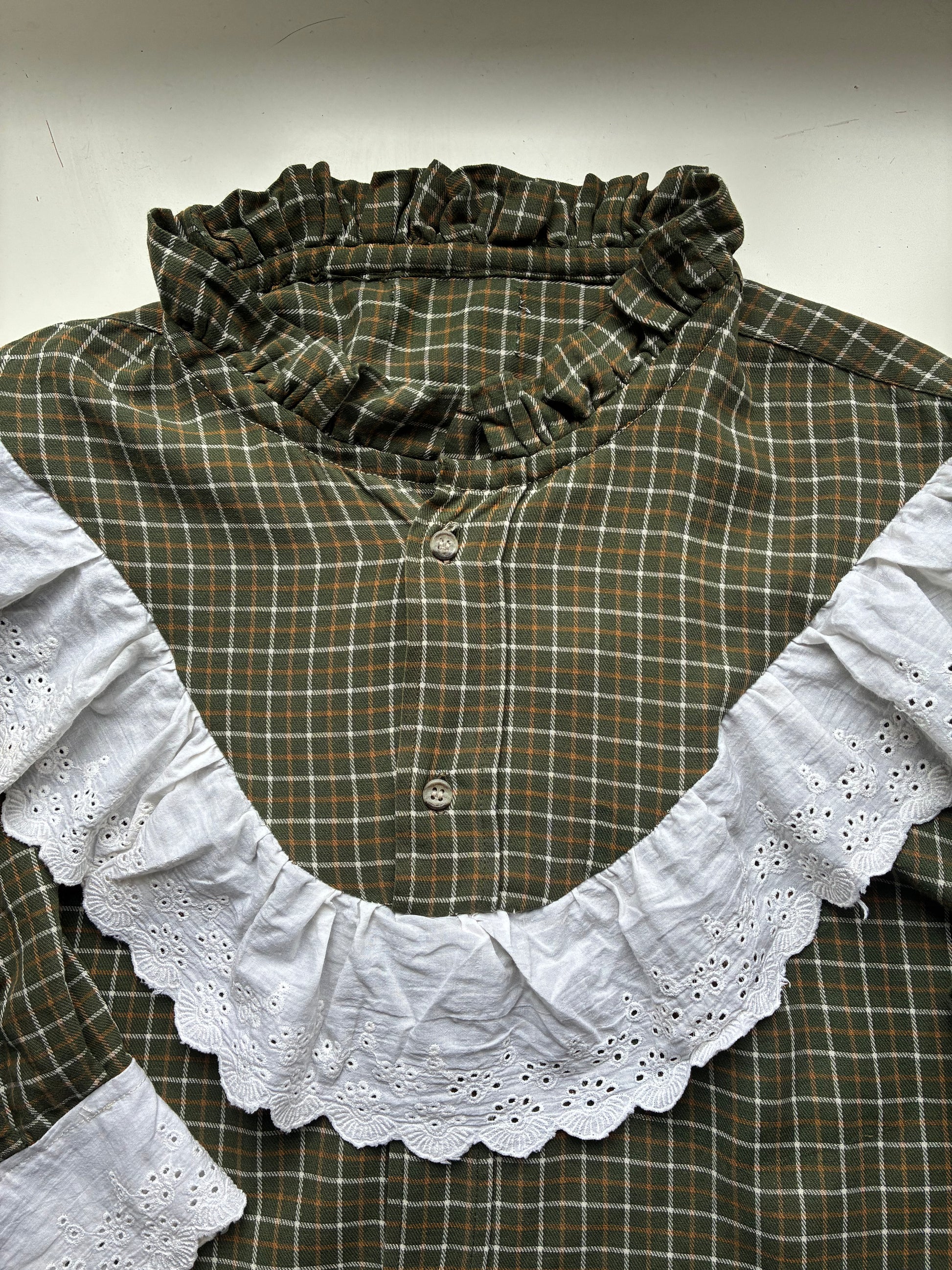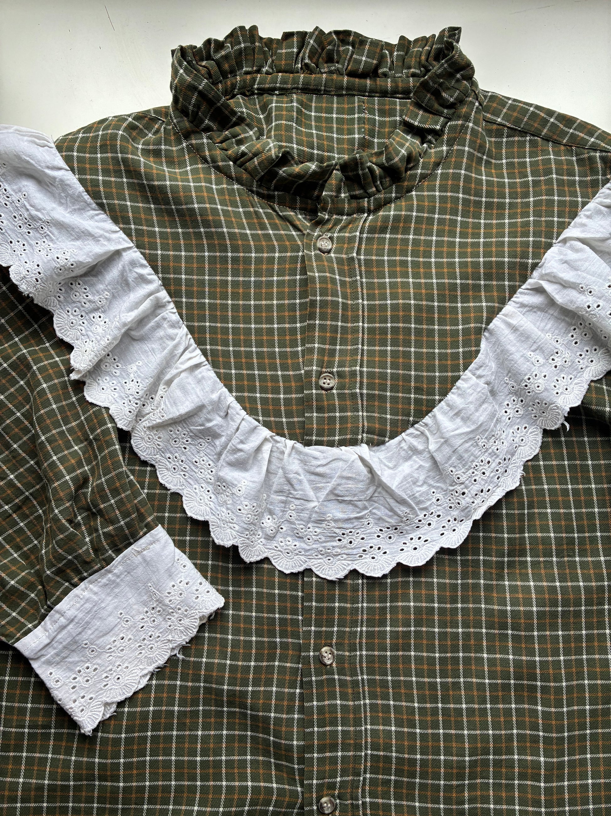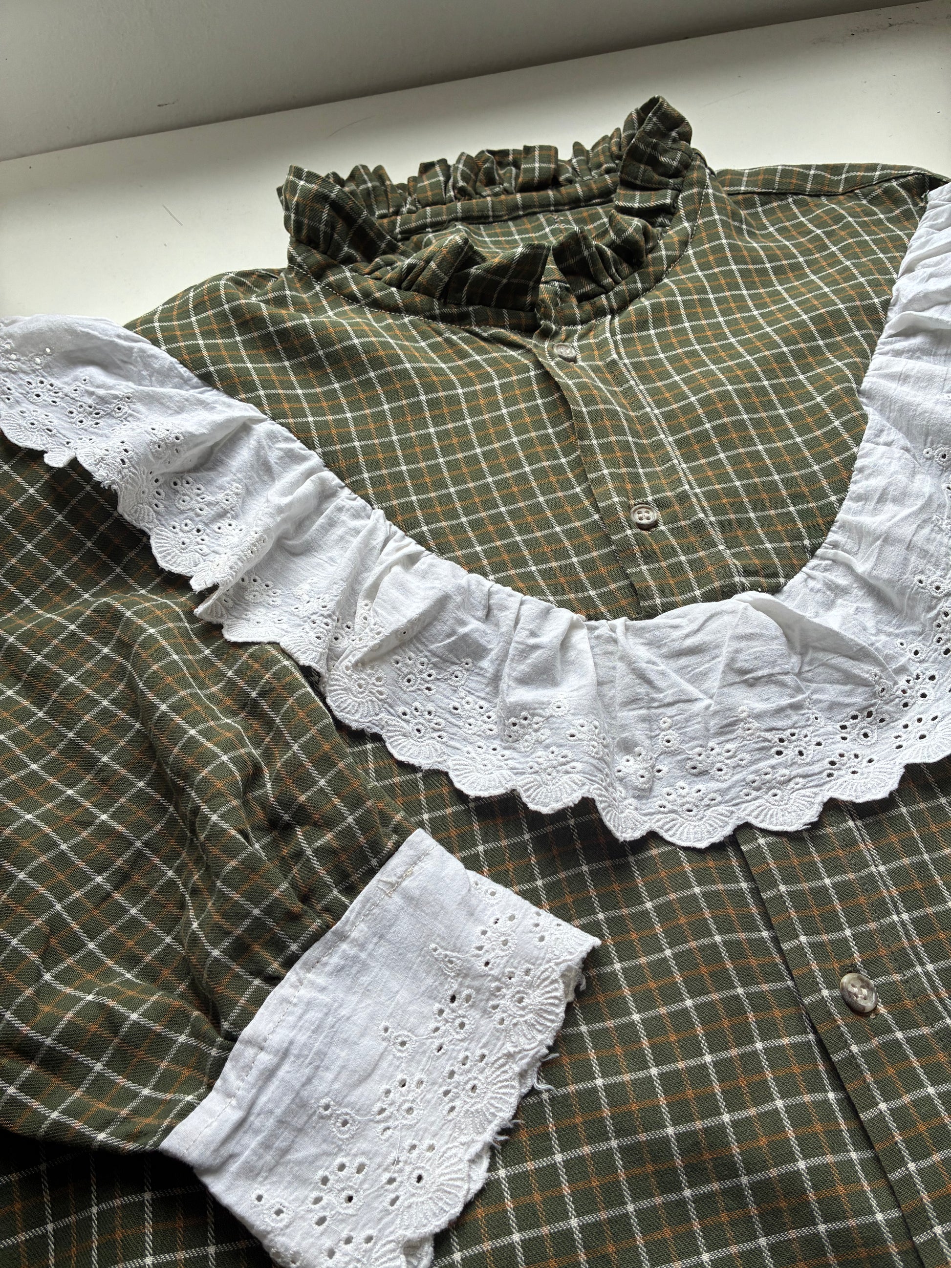 Chemise conçue à partir d’une chemise d’homme upcyclée et d’un galon de broderie anglaise.💕✨