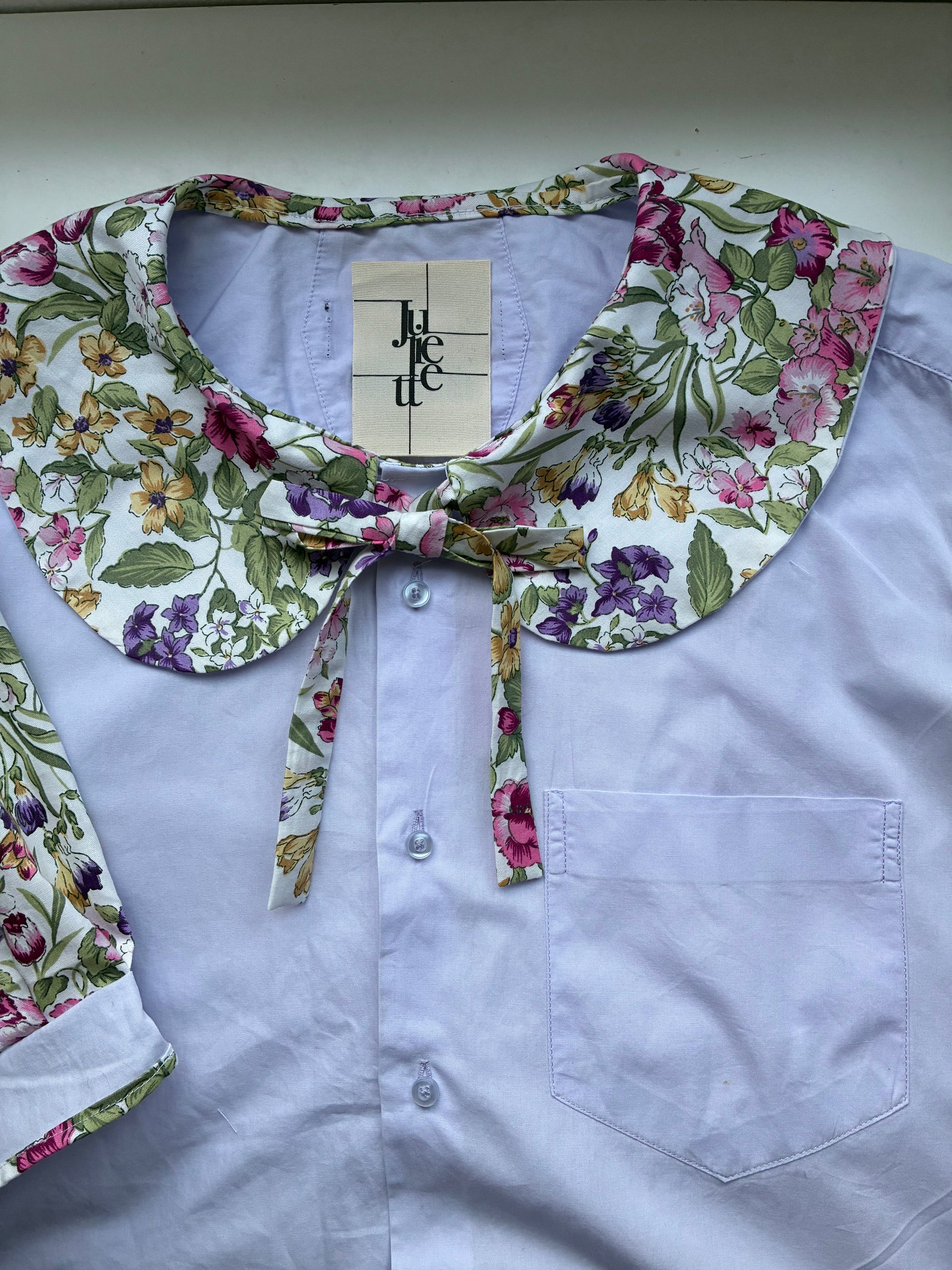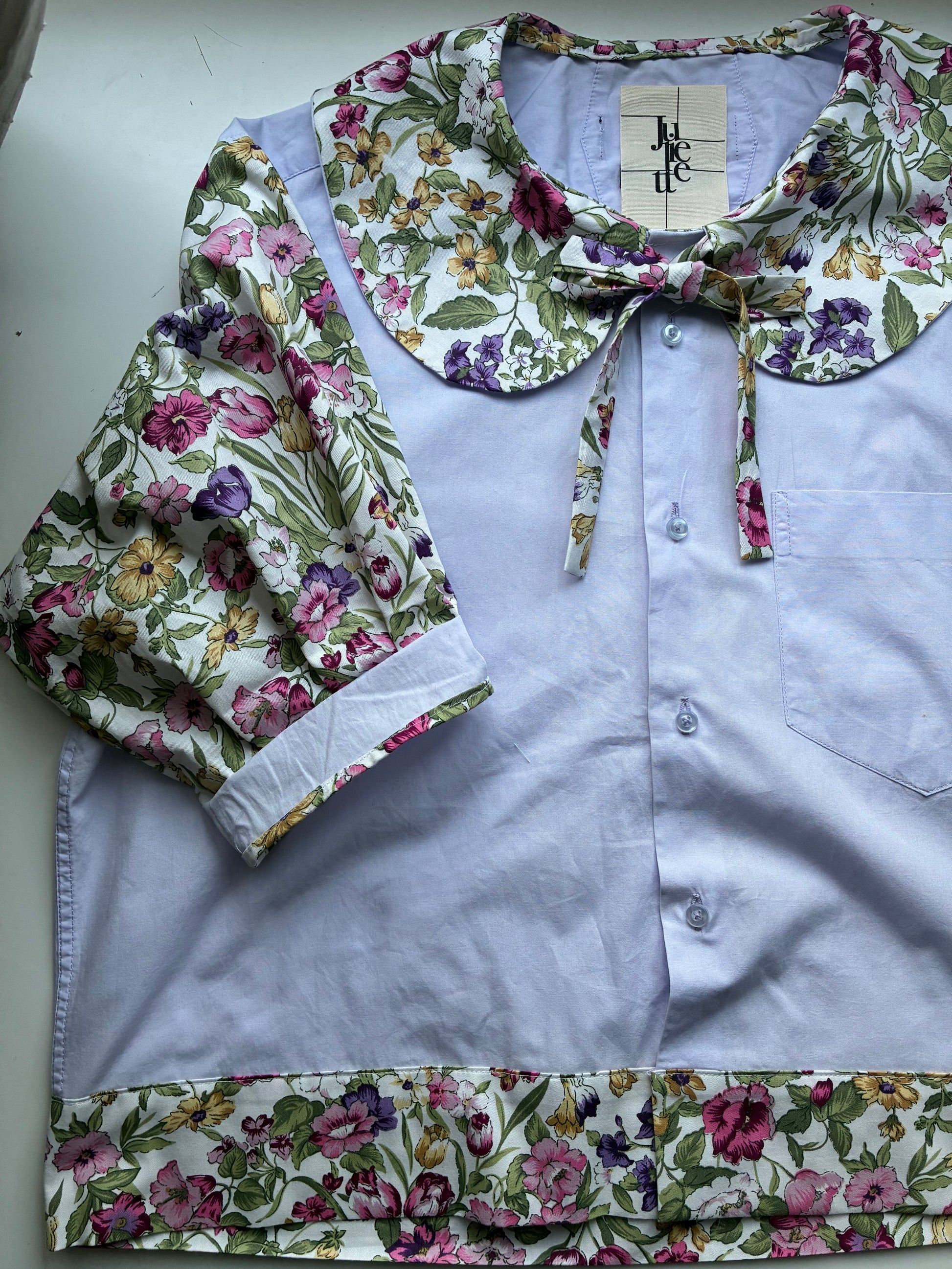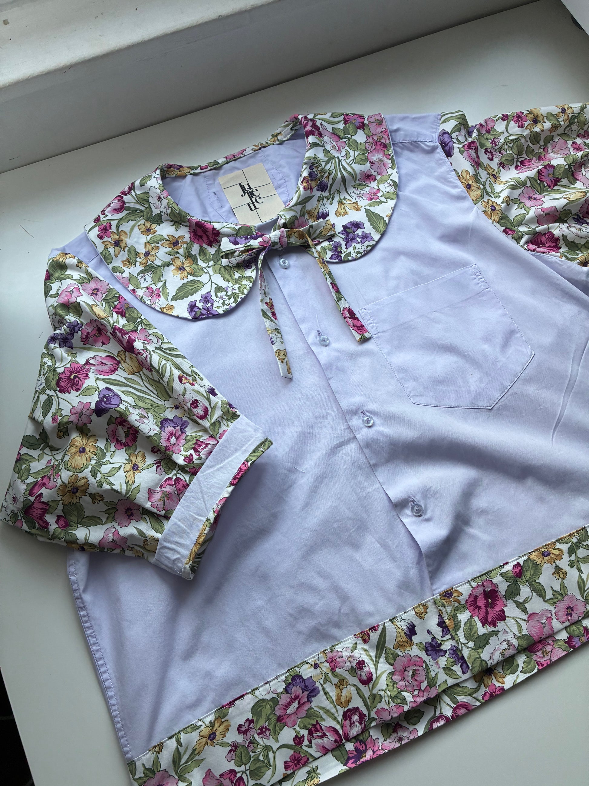 Col Claudine aux motifs floraux vintages agrémenté d’un joli noeud pour sublimer le port de tête. Manches ballon, mi-longues resserrées juste au-dessus du coude.🪡🎀
