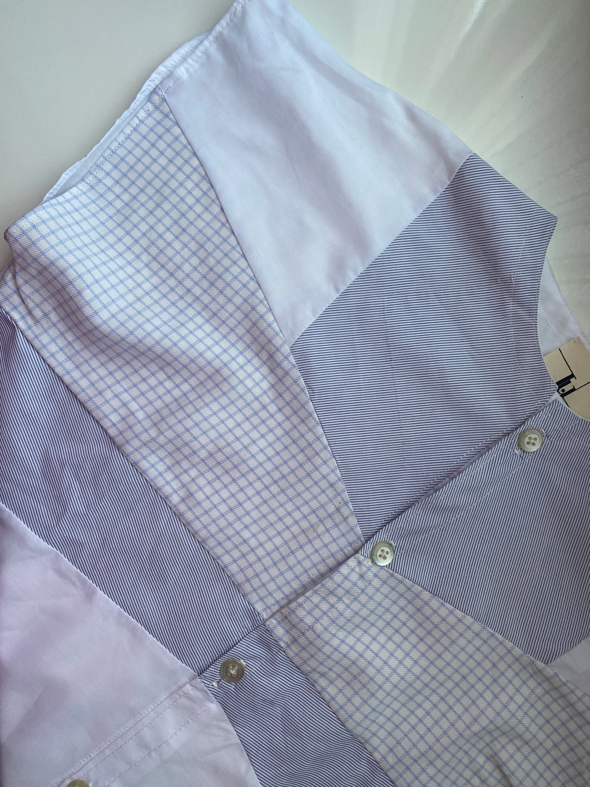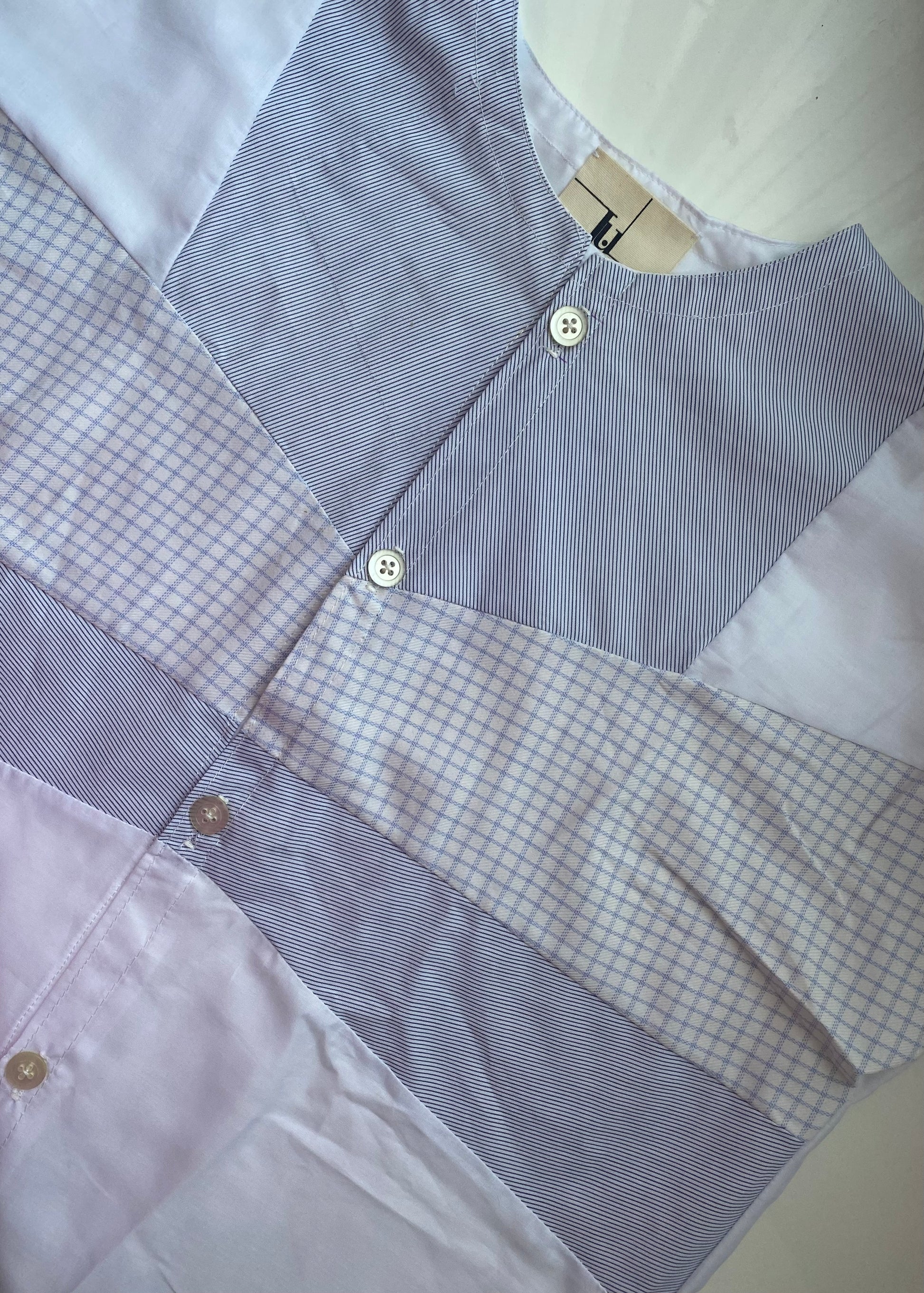 HÉLOÏSE est un chemiser composée de chutes de chemises upcyclées et de voile de coton. Elle est à manche courte.
