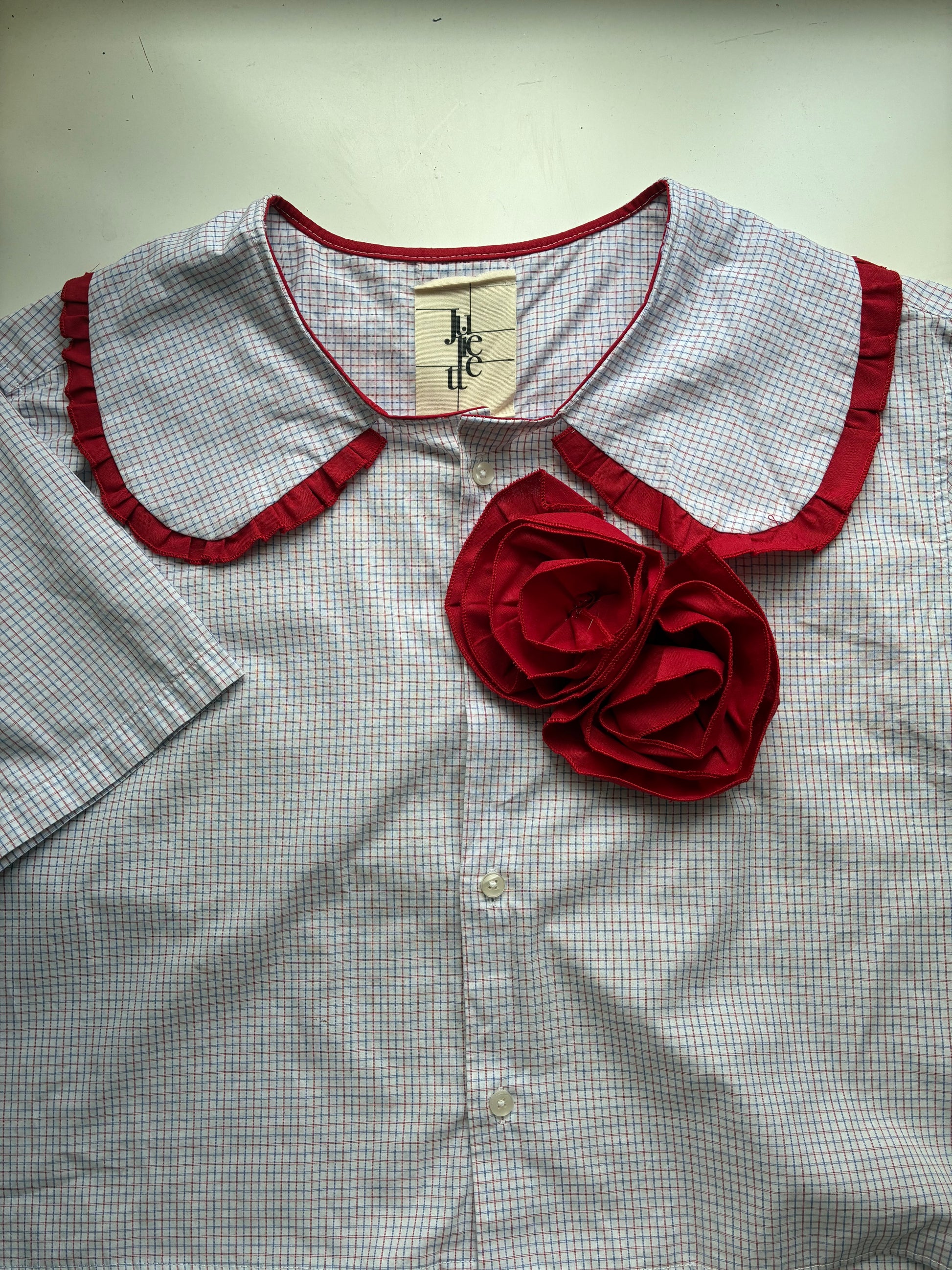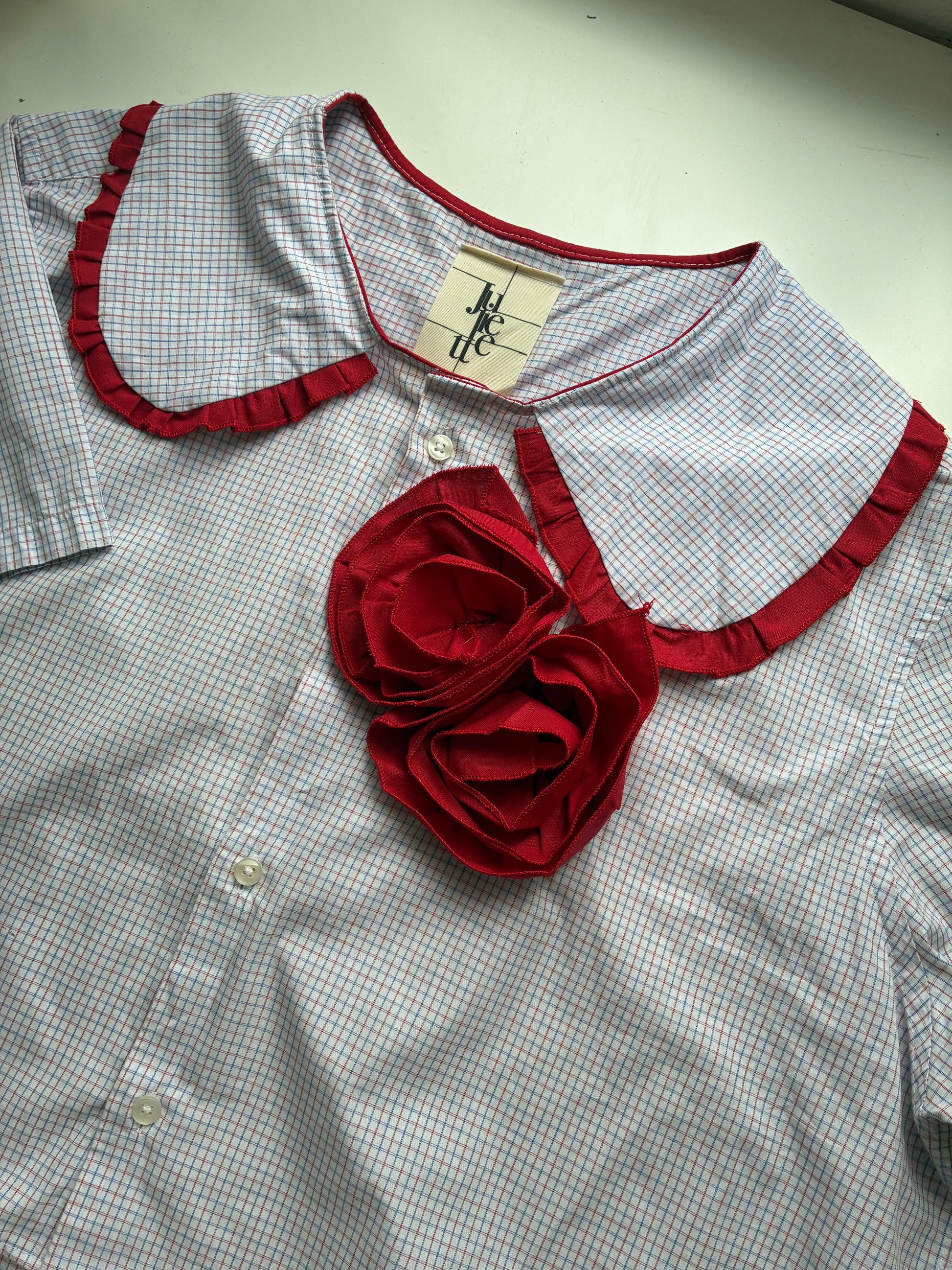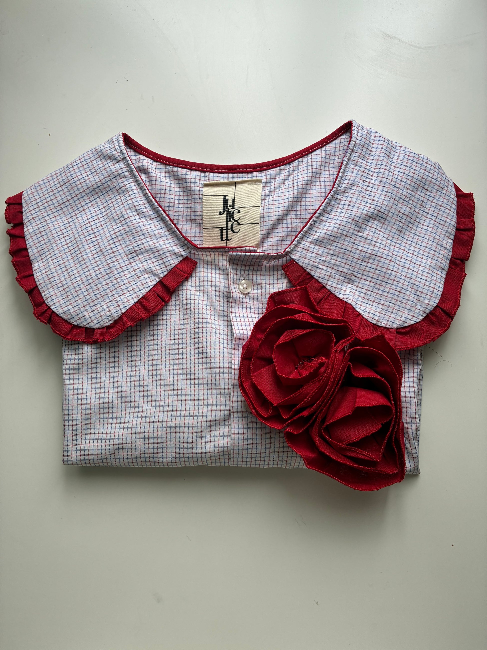 Col Claudine froufrouté et deux roses rouges sur la poitrine.🪡🎀
