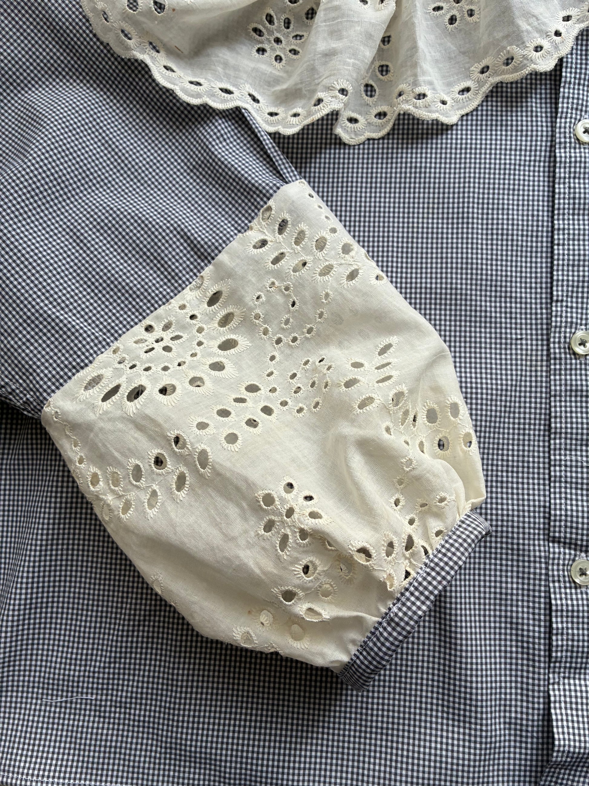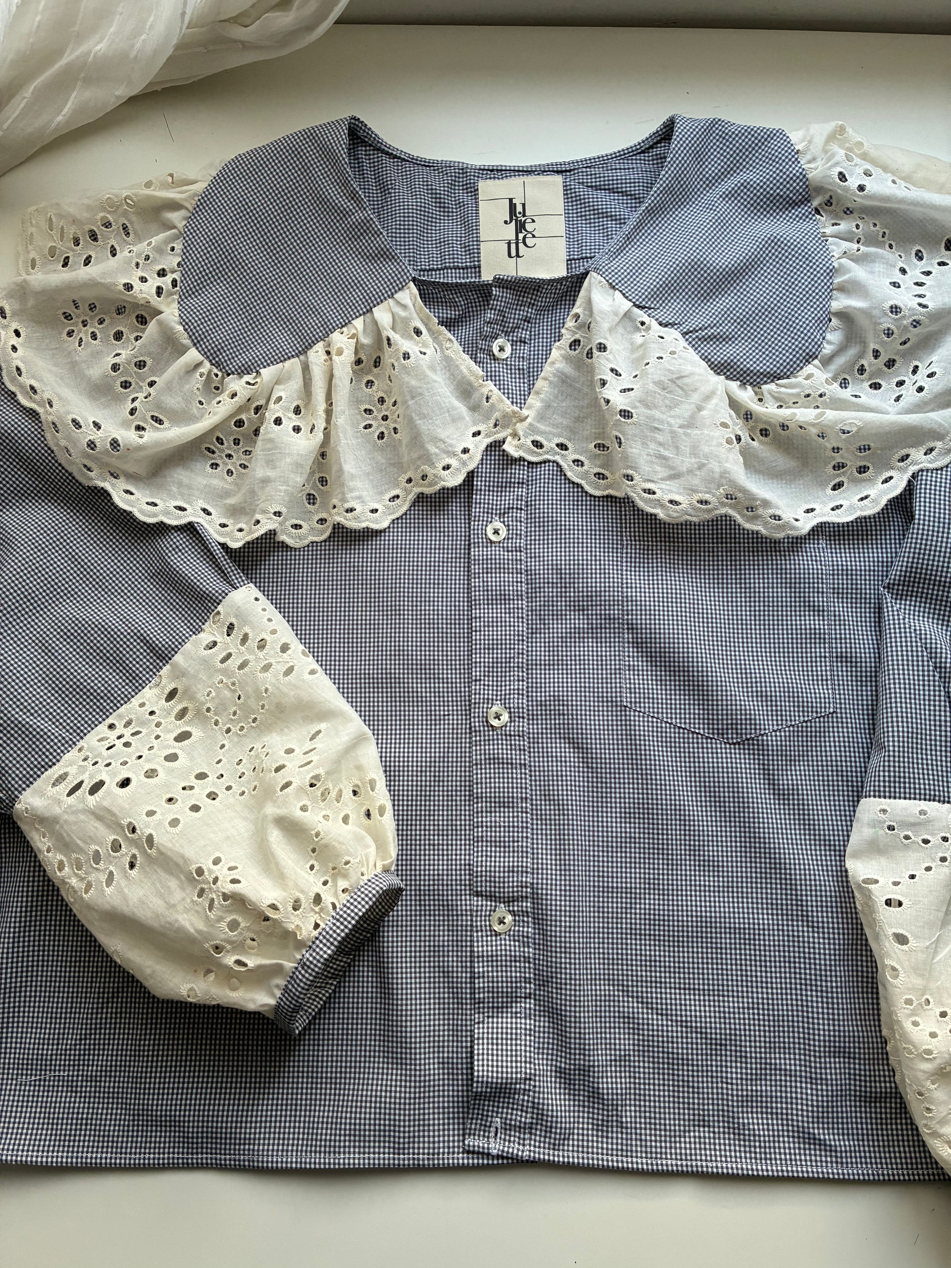 Col Claudine froufrouté d’une large dentelle écrue, manches en dentelle offrant de la transparence et poignets resserrés.🪡🎀