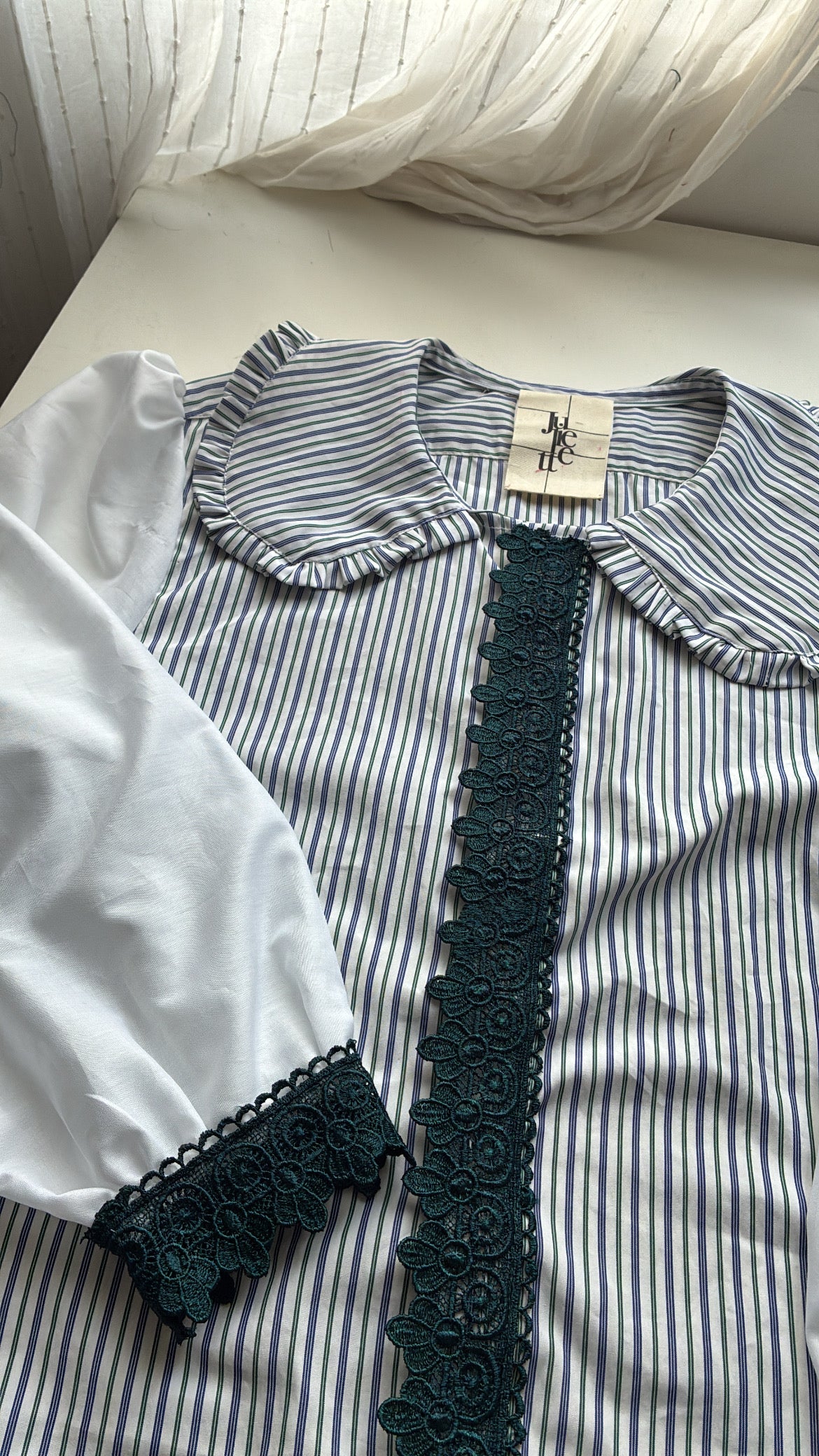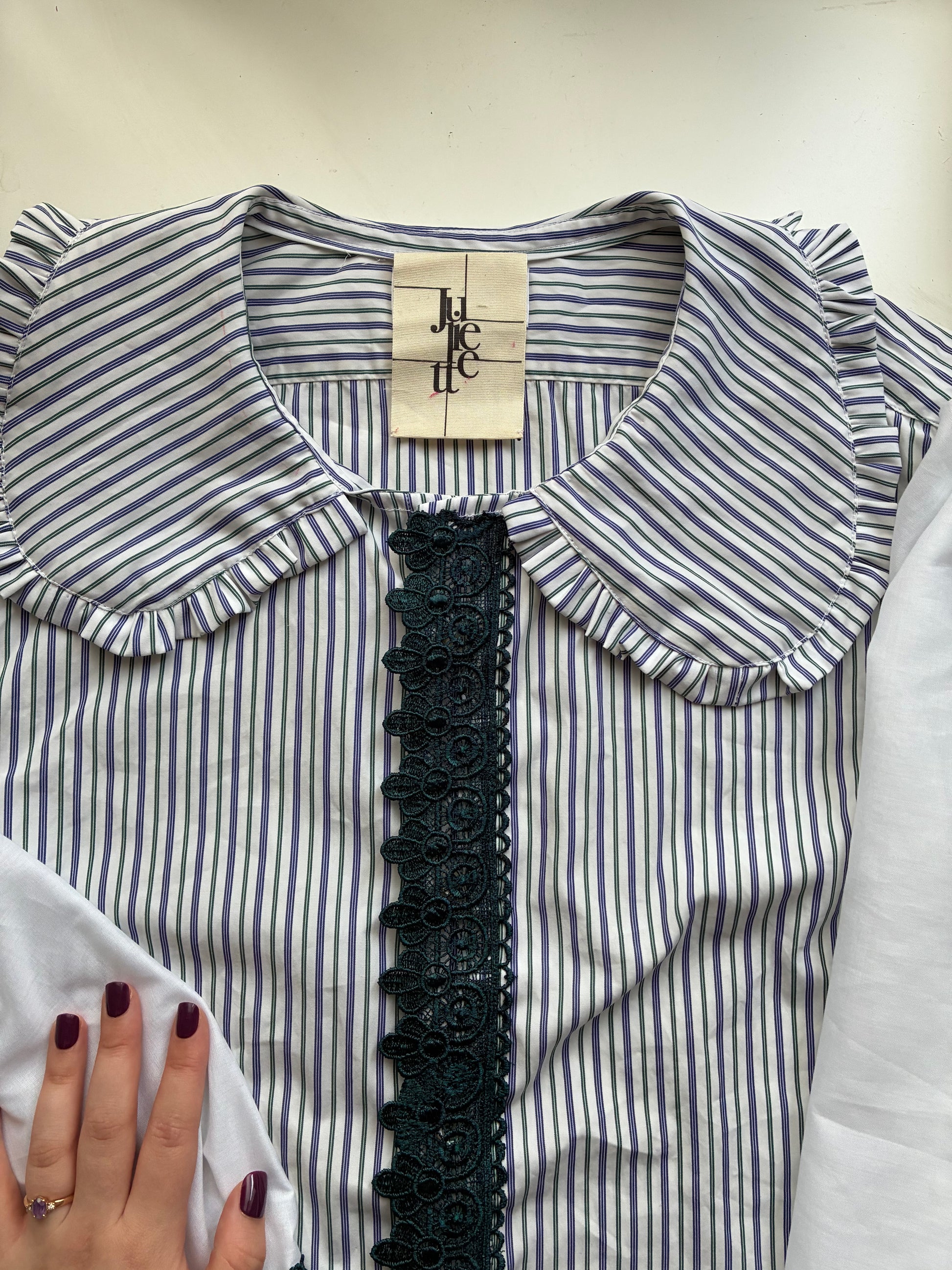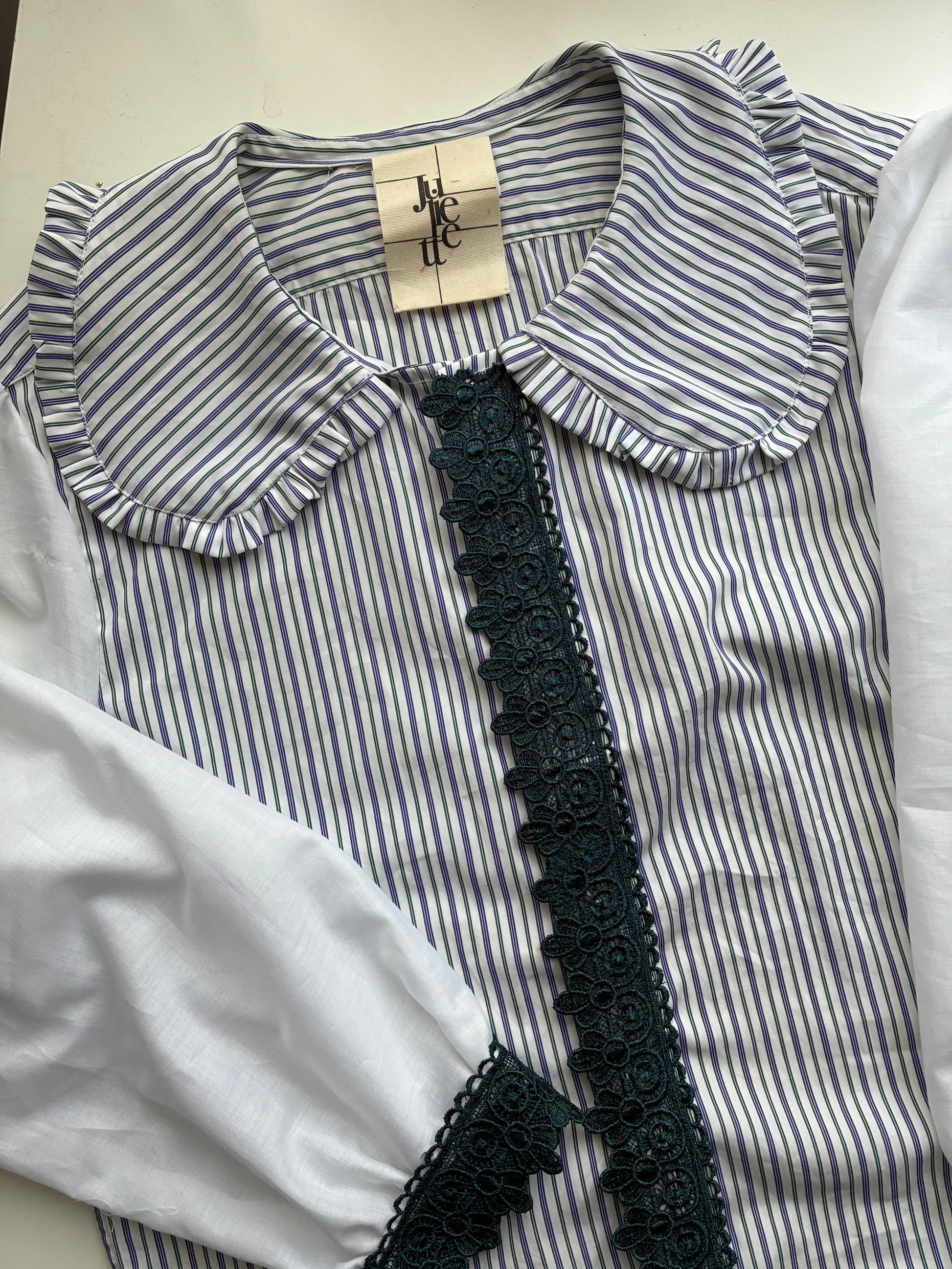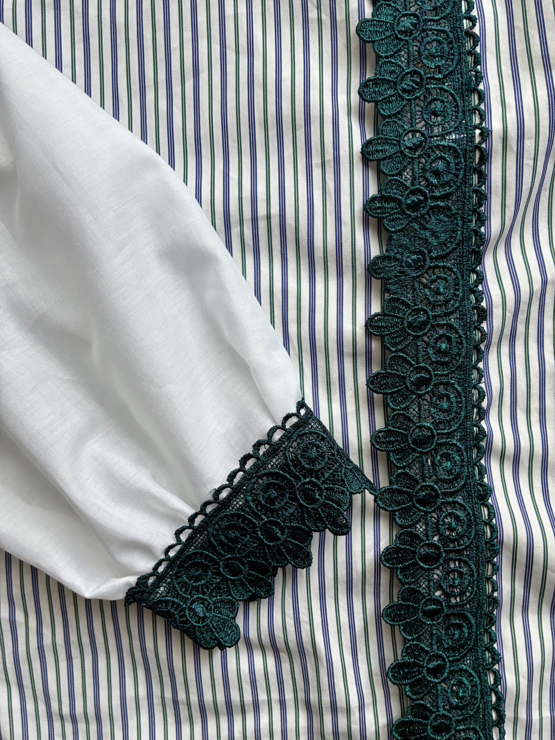 Col Claudine avec froufrou. Poignets et patte de boutonnage sublimés à l’aide de dentelle.🪡🎀