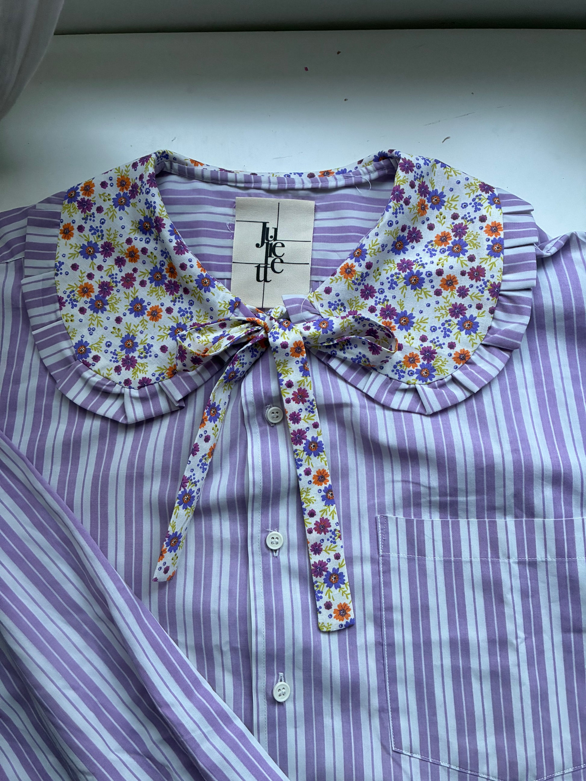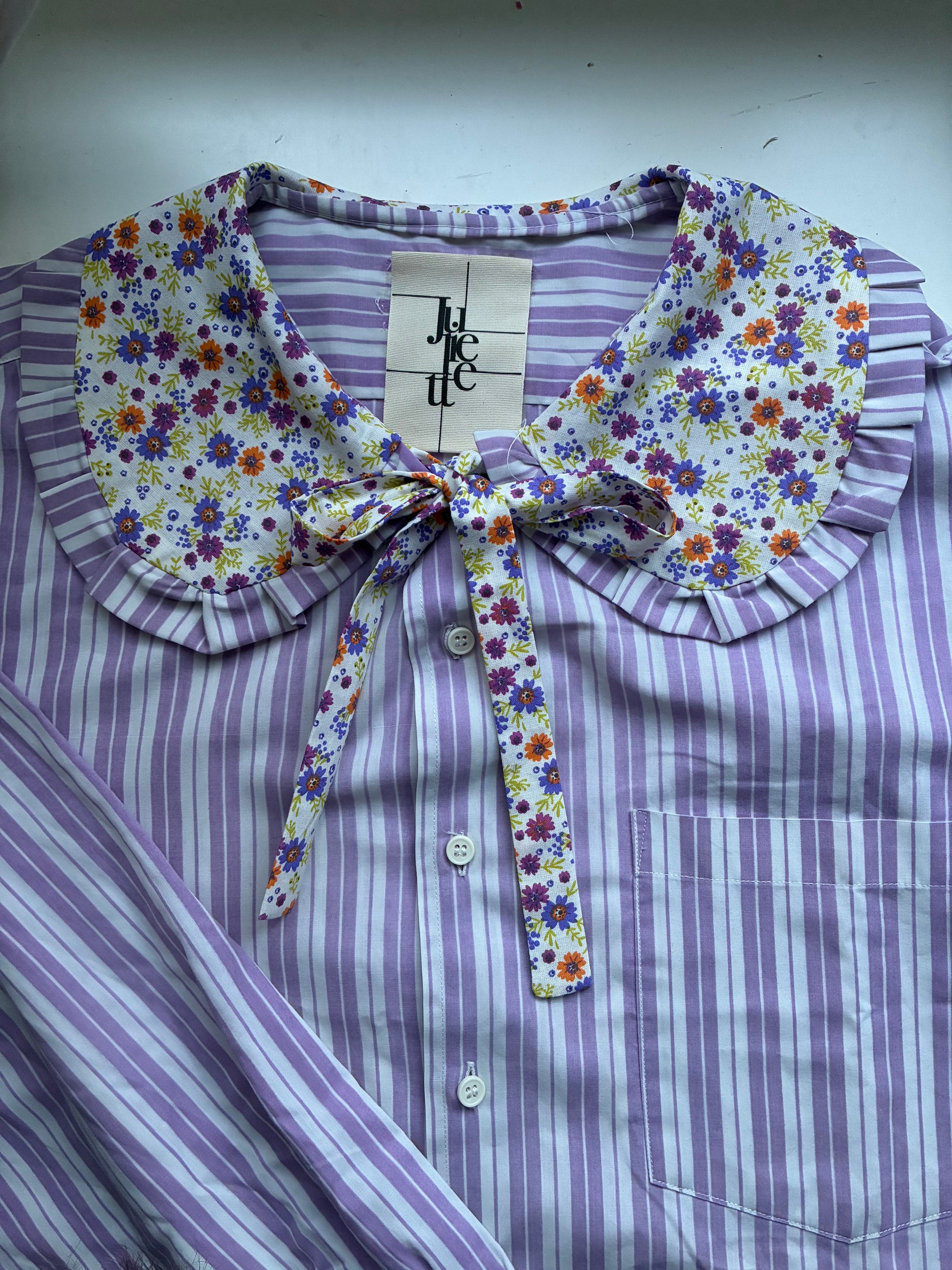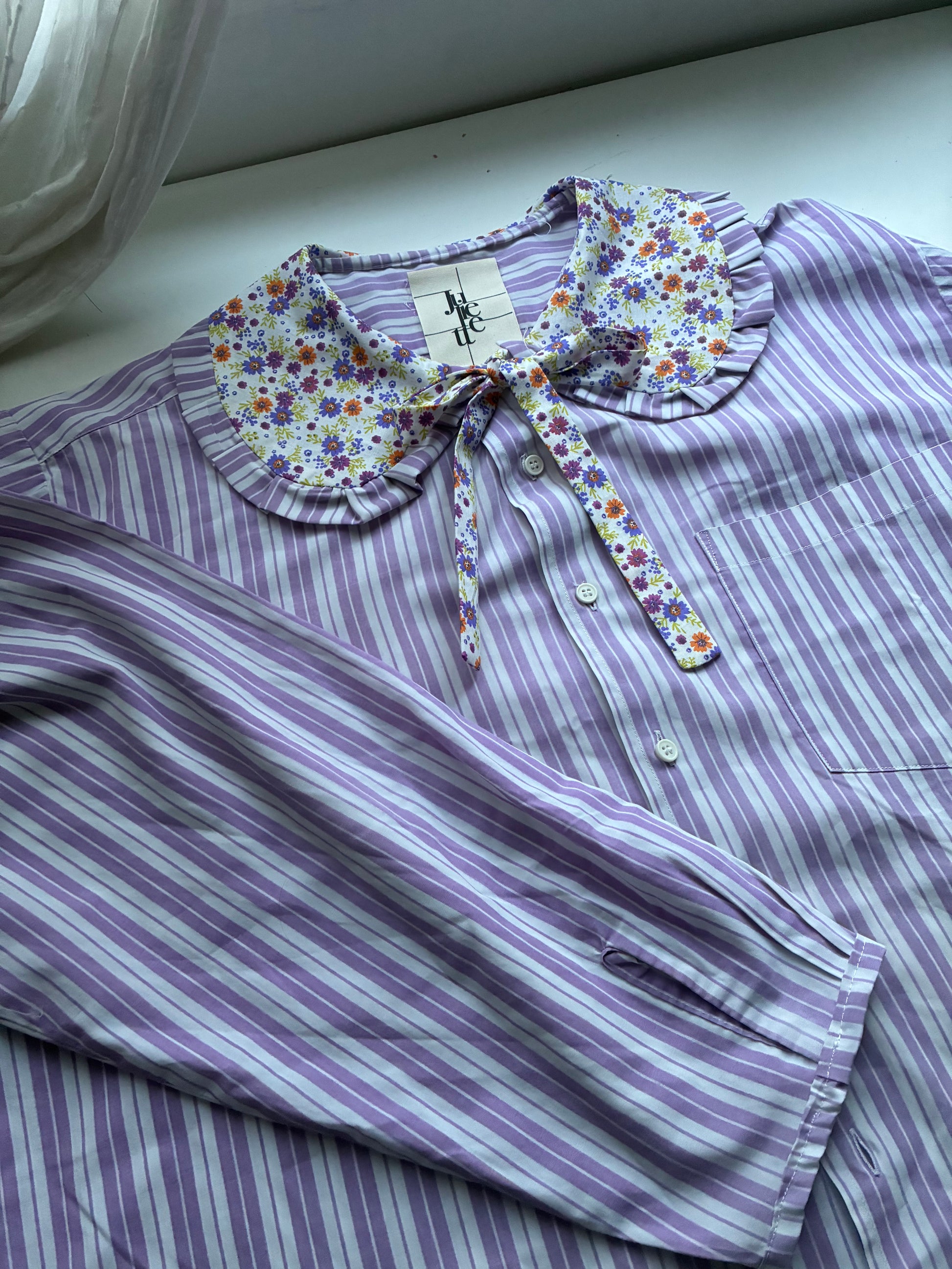 Col Claudine aux motif floraux vintages agrémenté de froufrous et d’un joli noeud pour sublimer le tout, poignets légèrement resserrés.🪡🎀